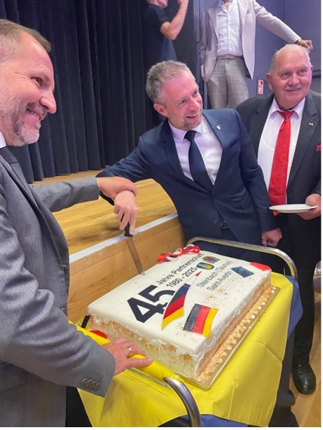 Durant ces quatre jours d’échange et de convivialité, français et allemands ont célébré dans la bonne humeur ces 45 ans de partage et d’amitié. Au programme : visite de Hofheim ville voisine de Steinbach jumelée avec Chinon, accueil officiel des 11 cyclotouristes, célébration des 25 ans de l’association « Culture et jumelage » puis des 45 ans du jumelage, participation à la journée de l’Europe à Schlossborn, visite de Steinbach avec le maire Steffen Bonk (voir la photo prise sur la place de Saint Avertin à Steinbach, chacune des villes ayant une place au nom de la ville jumelée), représentation de la pièce « Le choix des âmes » proposée par Stéphane Titeca et Alexis Desseaux.